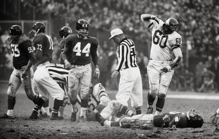 A foto que ilustra este post é clássica. É o momento posterior de um tackle desferido por Chuck Bednarik, linebacker do Philadelphia Eagles, em Frank Gifford, running back do New York Giants. Gifford viveu 84 anos e aparentemente esse tackle não lhe fez mal mesmo ele tendo ficado hospitalizado por alguns dias. Aparentemente, até porque ele teve uma vida saudável por muitos anos, sendo presença marcante na cabine de transmissão do Monday Night Football em seus primórdios. Aparentemente. Após sua morte, foi diagnosticado que ele tinha CTE – Encefalopatia Traumática Crônica, doença degenerativa do cérebro.