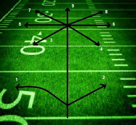 Para entender um pouco de qualquer playbook, dominar o conceito de rotas é fundamental. Obviamente, hoje em dia, existem diversos tipos – e abordar todos tornaria este texto insuportável. Apesar da diversidade, existe um consenso das nove rotas mais básicas que um recebedor deve saber. A árvore de rotas principais engloba nove tipos. As ímpares (1, 3, 5, 7) são aquelas que vão em direção a sideline e ficaram conhecidas como odd. Já as pares (2, 4, 6 e 8) cortam para o meio do campo e são conhecidas como even. Obviamente do lado esquerdo inverte-se a numeração: as da esquerda são as pares e as da direita são as ímpares. Não importa a direção nesta classificação e sim para onde está indo o recebedor. As nove principais rotas são (na ordem numérica): flat, slant, comeback, curl, out, dig (ou in), corner (ou flag), post e a go (ou fly). Elas levam essa numeração devido ser mais fácil comunicar o número do que o nome da rota. Quando no playbook existe a jogada ”nine-nine-nine” quer dizer que todos os wide receivers vão correr rotas fly – simples assim.
