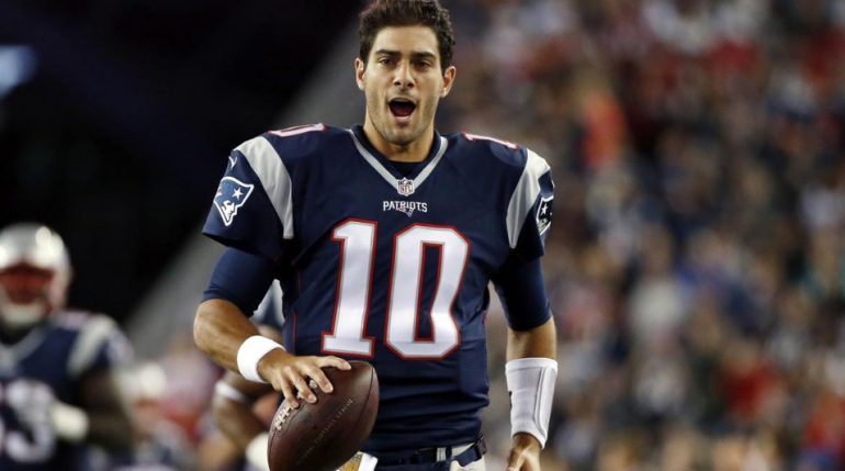Garoppolo se machucou depois de ser derrubado pelo linebacker Kiko Alonso. Tentado fugir do sack para prolongar a jogada e buscando algum recebedor livre, ele foi atingido em cheio por Alonso, que caiu com o seu peso sobre o ombro direito do quarterback. Jimmy sofreu uma entorse na articulação acromioclavicular (AC joint). Inicialmente surgiram informações de que a contusão poderia afastá-lo dos gramados por até seis semanas, mas posteriormente constatou-se que o problema não era tão grave. Segundo Ian Rapoport, New England espera que Garoppolo possa estar de volta já na semana 4 no confronto contra os Bills.