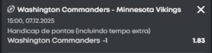 O Washington Commanders não tem uma grande campanha, mas o nível de atuação e organização por si só já é melhor que o do Minnesota Vikings, mesmo com a provável volta de J.J. McCarthy. Os dois times não possuem chances verdadeiras de playoffs, porém o momento dos Commanders é bastante superior; vale lembrar que eles perderam para o forte Denver Broncos por apenas um ponto e Jayden Daniels, de forma impressionante, volta a ser titular.