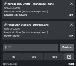 O Kansas City Chiefs está eliminado e vai jogar com Gardner Minshew, mas 1.59 é uma odd de bastante valor quando considerado o nível do adversário—até porque, convenhamos, o reserva podia ser muito pior. Ao mesmo tempo, o Detroit Lions tem um matchup ofensivo que casa muito bem com a defesa do Pittsburgh Steelers e joga pressionado para manter viva a briga nos playoffs da NFC, especialmente com a vitória do Chicago Bears ontem.