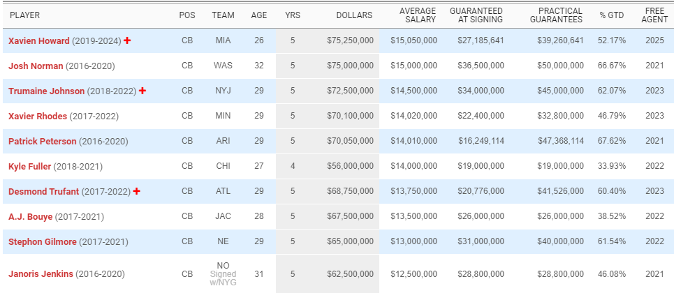 Como dissemos acima, Stephon Gilmore é uma exceção a pagar os contratos de topo de mercado. Mas isso não faz com que ele seja uma exceção no conceito de valor descrito acima: atualmente, ele é apenas o 9º cornerback com a maior média salarial da posição na liga, de acordo com o site Spotrac: