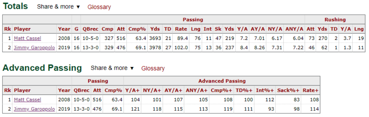 Por mais que pareça estranho, Jimmy Garoppolo e Matt Cassel tem muitas semelhanças. Ambos foram draftados pelo New England Patriots, lapidados pelo coordenador Josh McDaniels e foram ter sua primeira temporada completa após um bom tempo na liga. Também, tiveram boa produção quando se tornaram titulares, cercados por um bom sistema e mentes ofensivas a frente de seus tempos. Não bastante, contaram do outro lado da bola, com defesas que estiveram entre as 10 que menos sofreram pontos naquele ano. Os números de ambos inclusive, são bem-parecidos.