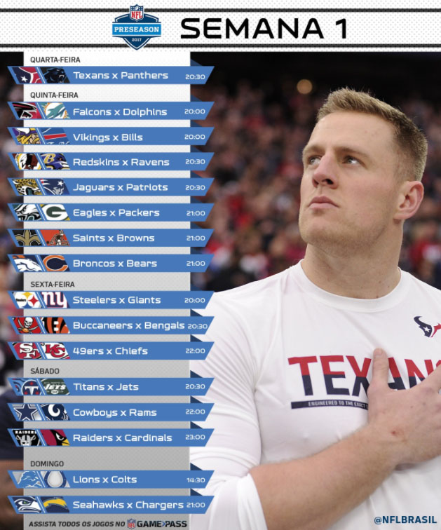A semana 1 da pré-temporada se encerra no domingo, com duas partidas. Abaixo, você confere o calendário completo de jogos. Excepcionalmente nesta semana, não há transmissões na ESPN – todos os jogos podem ser assistidos pelo GamePass, o pay per view da NFL (que está com sete dias de cortesia).